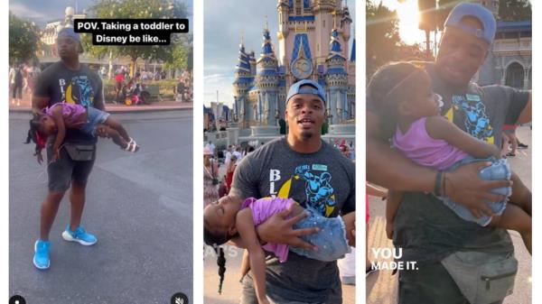 视频一开始是这位被称为Phil The Culture的叔叔抱着他3岁的侄女Maliha Cotton的画面,配文是“POV:带一个蹒跚学步的孩子去迪士尼就像……”