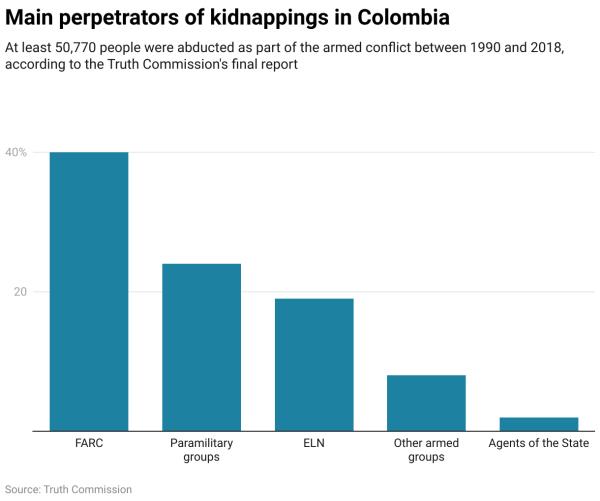 计算受害者总数并不是一件容易的事。有几家机构试图提供相关数据。几年前,美国国家历史记忆中心(National Center of Historical Memory)的一项调查记录了在40年里至少被绑架过一次的39058人。在1990年至2018年武装冲突的背景下,真相委员会将这一数字提高到至少50770例,尽管它估计,漏报可能使实际数字更接近8万例。主要的作案者是现已解散的哥伦比亚革命武装力量(FARC),占了40%的绑架案,其次是其他准军事组织(24%)和ELN(19%),在此期间共实施了9538起绑架案。
