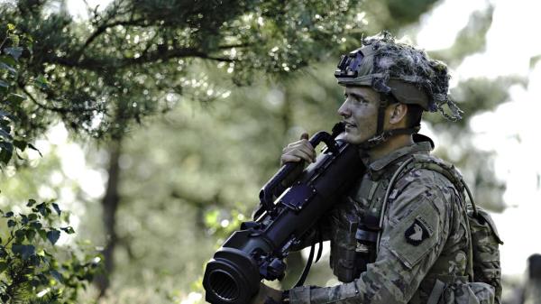 一名美军士兵在训练中拿着手枪“卡尔·古斯塔夫”模型。?Ssgt。Oscar Gollaz /美国陆军/ imagago Images