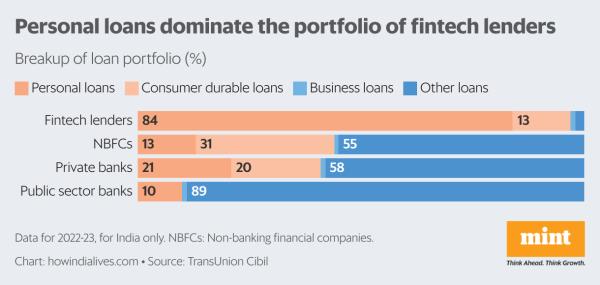 金融科技贷款严重倾向于个人贷款和耐用消费品贷款,这两类贷款约占金融科技贷款组合的97%。nbfc和私人银行的这一比例为41% -44%,而公共部门银行的这一比例约为10%。