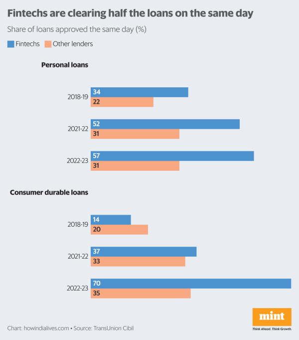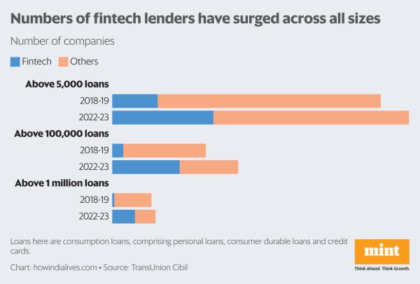 根据信贷机构TransUnion Cibil的数据,2022-23年金融科技行业提供的消费贷款总额(包括个人贷款、消费者耐用贷款和信用卡)为8400亿卢比。同年,包括银行和非银行金融公司(nbfc)在内的金融部门的总体消费贷款为11万亿卢比。