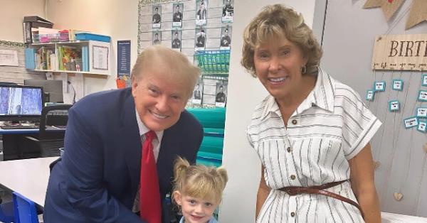 劳拉·特朗普发布的一段视频显示,前总统唐纳德·特朗普在学校看望了他的孙女卡罗莱纳,小女孩向她的爷爷展示了她的桌子。