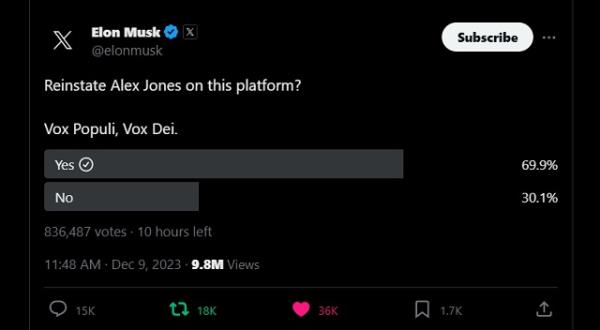 周六,埃隆·马斯克发布了一项关于是否解雇亚历克斯·乔的民意调查他还宣称:“如果人们投票让(琼斯)留任,这将对X的财务造成不利影响,但原则比金钱更重要。”