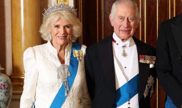 周二晚上,卡米拉女王身着耀眼的白色礼服出席白金汉宫外交招待会,并系上了白色领带。