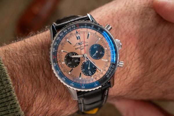 “导航计时器是我们的超级图标。我喜欢三文鱼盘和co黑色柜台和黑色外条纹形成鲜明对比。