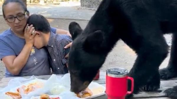 在视频中,黑熊在享用墨西哥美食盛宴时,一名妇女捂住了一个孩子的脸。