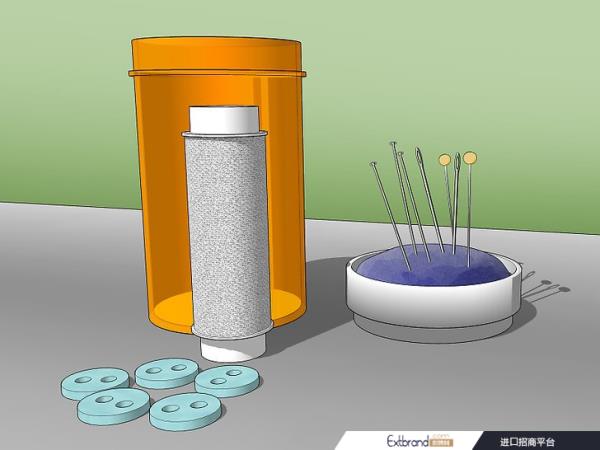 制作一个便携的缝纫包。你可以在一个空药瓶里制作自己的小针线包。用两根针、一卷白色、海军蓝或其他常见颜色的线和几颗纽扣把它包起来。在瓶盖的内侧,粘上一个小的针垫。