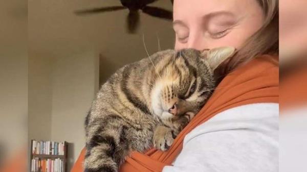 在视频中,这位女士展示了她是如何满怀爱意地牵着她的老猫到处走的。