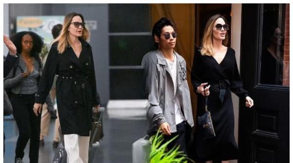 周五,安吉丽娜·朱莉带着19岁的帕克斯和18岁的扎哈拉来到纽约肯尼迪机场,展示了她的时尚感。