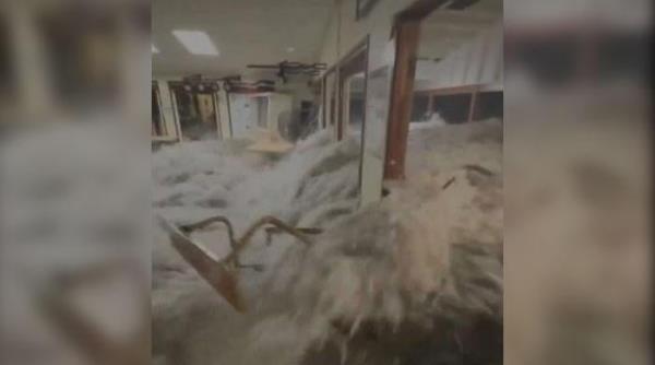 在社交媒体上疯传的一段视频显示,大量的破坏者袭击了美国驻军,导致水撞倒了旁观者,打碎了玻璃门,打碎了窗户。