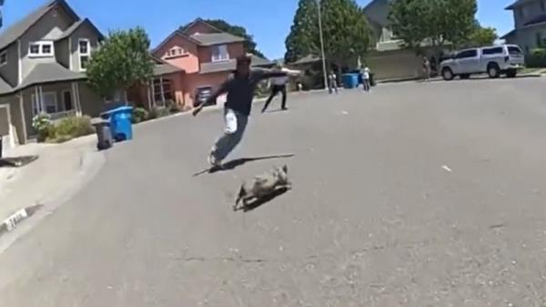警方分享的视频还显示,这只猪在警察和一名当地居民的追捕下,穿过停车场、穿过街道,甚至跑到一辆汽车下面。