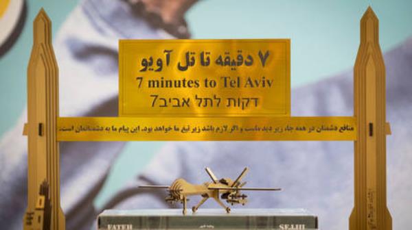 资料图:2024年3月27日,伊朗德黑兰,反以色列标语下的伊朗导弹和无人机3D模型。?Morteza Nikoubazl/NurPhoto via Getty Images