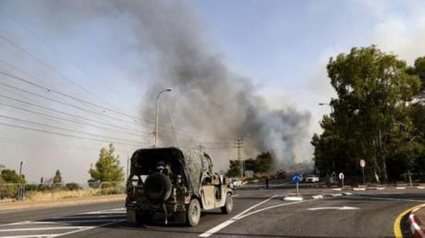 2024年7月4日,在以色列上加利利,一辆以色列军用吉普车停在检查站附近,从黎巴嫩南部发射的火箭弹引起的大火中升起烟雾?法新社/ Jalaa Marey