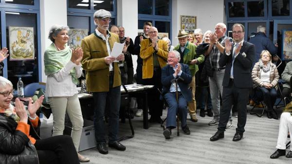 为伟大的漫画家鼓掌:汉斯·雷瑟(手里拿着手稿)目前正在埃尔贝斯特拉斯的市政画廊展出他的作品。
