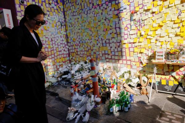 2022年10月29日的悲剧在梨泰院随处可见。在遇难人数最多的小巷里,一个用明亮的灯光勾勒出的小纪念碑被竖立起来。墙上仍然贴着五颜六色的小标语,表达着幸存者及其亲人的痛苦。