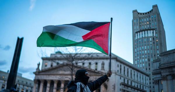 3月19日,在美国纽约市,以色列和巴勒斯坦伊斯兰组织哈马斯之间的冲突仍在继续,抗议者要求停火并结束对加沙的袭击,纽约警察在抗议者面前站岗。