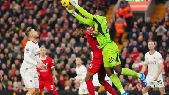 曼联门将安德烈·奥纳纳解围,利物浦队的瑞恩·格拉文伯奇进行了挑战。