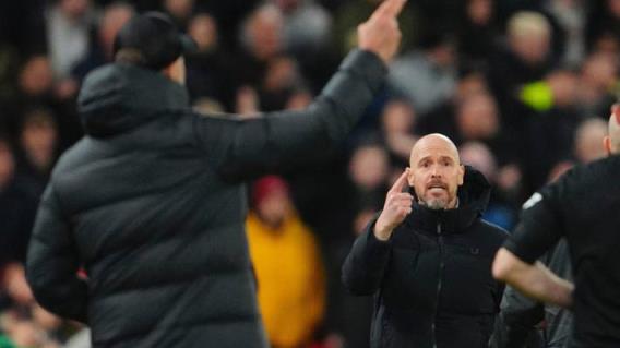 曼联主教练埃里克·哈格(中)和利物浦主教练尤尔根·克洛普在两队在安菲尔德0-0战平时的反应。