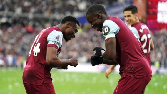 西汉姆联队的穆罕默德·库德斯(左)在与狼队的比赛中打进了他的第二个进球。