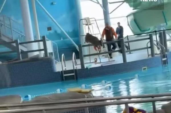 西诺的视频显示,这只鹿在娱乐中心工作人员的追赶下跳入游泳池。