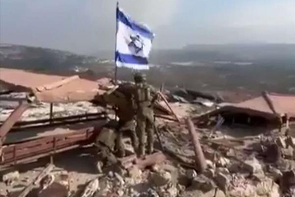 10月8日星期二,以色列士兵在撤离前将他们的大卫之星旗插在黎巴嫩马鲁恩拉斯村的废墟上。这个边境村庄位于海拔900米的地方,可以一览无余地看到不到一公里外的以色列小镇Avivim。这是自以色列9月30日在黎巴嫩南部发动地面进攻以摧毁真主党的“进攻性基础设施”以来第一次宣布胜利,尽管这一胜利转瞬即逝。