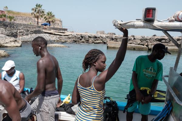 皮埃尔·安托万·桑布(Pierre Antoine Sambou)在头上挥舞着一面红黄绿相间的塞内加尔国旗,微笑着走向停靠在码头的小船,他的潜水同伴们在一旁欢呼。