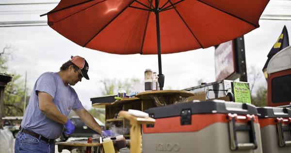 这位海岸警卫队老兵花了大约45分钟的时间,在西大街西北五金公司停车场的一个角落里,把手推车、雨伞和相关的冷却器摆好。上午11点,蒸汽从马车的丙烷燃料桶里升起。饥肠辘辘的顾客开始光顾。