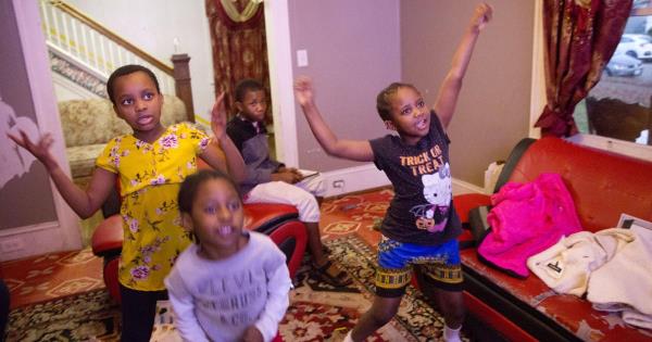 Mwenebyake Alebelebe坐在餐桌旁,和妻子Mwasi Binge一起享用刚果传统美食,其中包括一种玉米粉粥ugali。在对面的客厅里,孩子们一边嚼着塑料桶里的芝士泡芙,一边随着大电视屏幕上播放的YouTube上的音乐视频跳舞。在最近一个寒冷的12月晚上,他们的家里充满了笑声和音乐声。