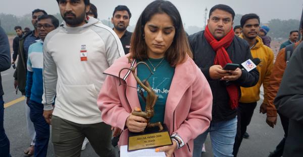 Phogat和奥运奖牌得主Sakshi Malik和Bajrang Punia一起,抗议前印度摔跤联合会(WFI)主席Brij Bhushan Sharan Singh的亲密助手Sanjay Singh当选,后者被三名知名摔跤运动员指控性骚扰。