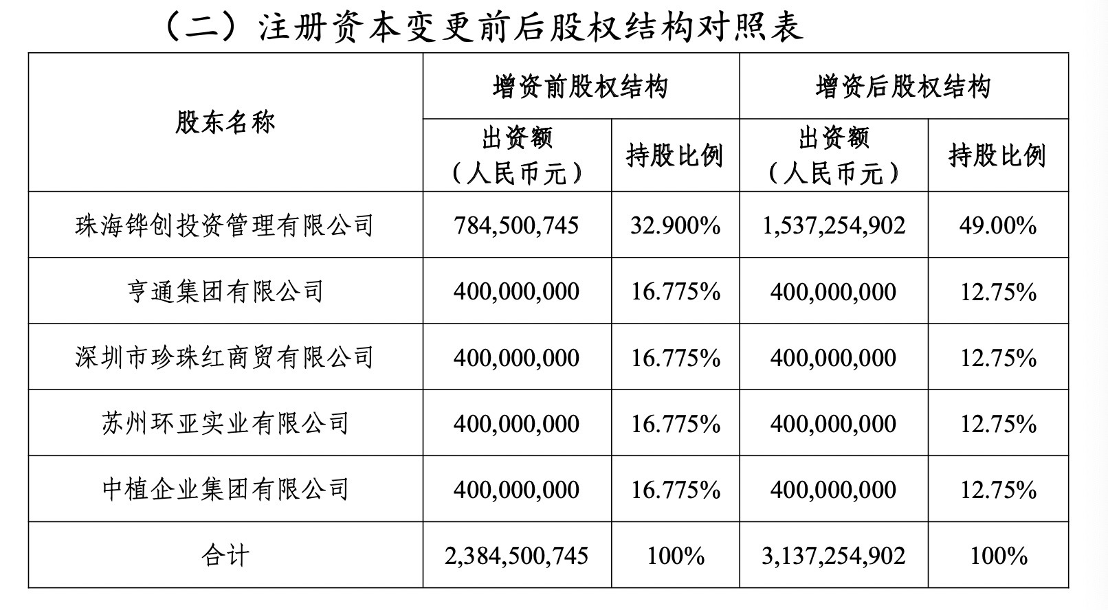 深圳国资背景的珠海铧创,持股比例将提升至49%,或超过监管规定的单一股东持股比例上限。中植企业集团有限公司(以下简称“中植集团”)等四家未参与增资的股东,持股比例从16.775%缩水至12.75%。