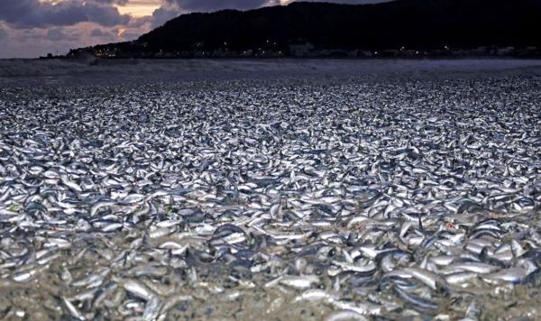 成千上万条死鱼被冲上日本北部的海滩。