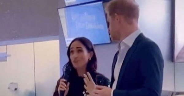 在视频片段中,可以看到梅根和哈里并排站在房间的前面。