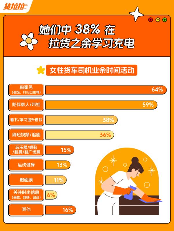 业余时间,女性货车司机除了回归家庭以外,也会根据自己的需求和爱好来选择适合自己的活动方式。根据《报告》,女性货车司机中64%将业余时间用于做家务,59%选择陪伴家人。值得一提的是,女性货车司机中有38%会选择利用业余时间看书、学习以提高自己的专业素养和竞争力。