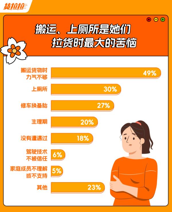 找货、装货、卸货……在与体能、力量密切相关的货运行业,女性货车司机与男性相比面临天然劣势。根据《报告》,女性货车司机中有49%会感觉自己搬运货物时力气不够,30%则遭遇上厕所难题。除此之外,修车换备胎、生理期等也是女性货车司机拉货时面临的主要困难。