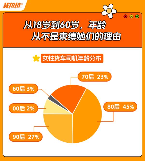 整体上看,女性货车司机呈现出年龄覆盖广、驾龄较长、学历以初高中为主的群体特点。据《报告》显示,女性货车司机中有76%为初高中学历。在年龄分布上,80后占比45%,为女性货车司机主力,90后和00后作为货运新生力量,占比则将近30%。在她们之中,最小年龄为18岁,最大年龄为60岁,互联网货运平台为不同年龄阶段的女性提供了就业机会。