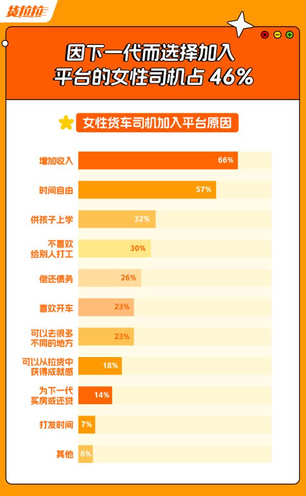 近些年,随着平台经济的兴起,灵活就业逐渐成为一种新的就业趋势和就业渠道。《报告》显示,凌晨四点开始,女性接单人数逐渐上涨,下午十四时到达高峰,十六时后接单人数便开始逐渐缩减。在加入平台原因方面,女性选择加入平台一方面是为了增加收入,另一方面也是因为其工作时间灵活,能够更好地兼顾工作和家庭。《报告》显示,在女性货车司机加入平台原因方面,增加收入、时间自由和供孩子上学为女性货车司机选择加入平台的三大主要原因,占比分别为66%、57%和32%。