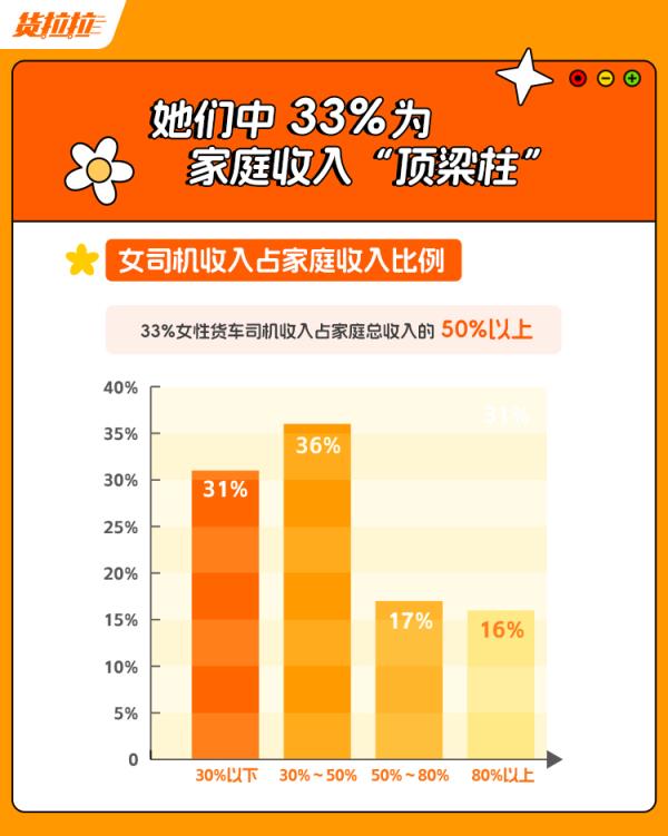 不同于大众传统印象,在她们之中,83%是驾龄4年以上的“老司机”。加入平台之前,女性货车司机大多为个体户、家庭主妇、工厂工人或企业职员,加入平台后,通过接单拉货,不少女性货车司机能够获得稳定且持续的收入。数据显示,约三分之一女性货车司机收入占家庭总收入的50%以上,为家庭主要收入来源。