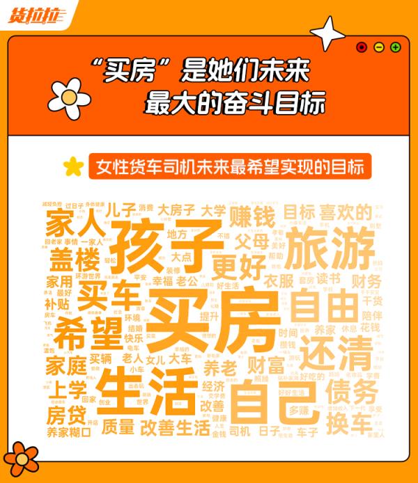 对于未来,女性货车司机们也有着许多期盼。《报告》显示,女性货车司机们的未来目标主要围绕“房子”“车子”和“家庭”这三大方向展开,“买房”“买车”“旅游”“家人”“孩子”为未来目标中出现的高频词汇。