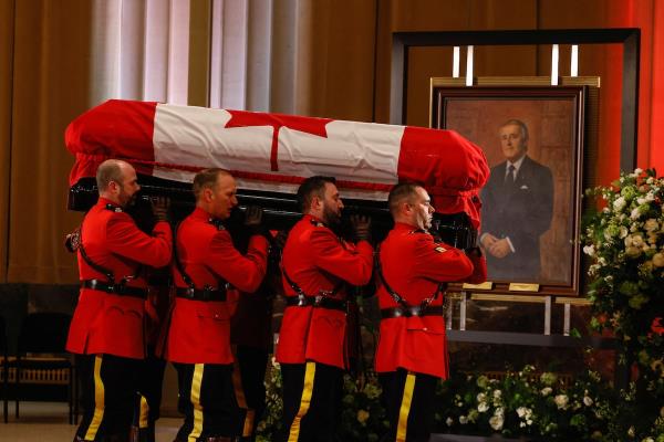 加拿大总理贾斯汀·特鲁多(Justin Trudeau)跟在西蒙后面,特鲁多独自走了进去,向家人问好,并向灵柩鞠躬。