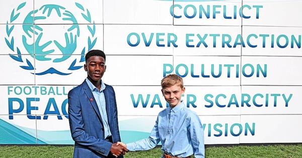 在一场青少年慈善足球比赛中,11岁的克拉克·迪尔森从12岁的哈里·阿切姆邦那里接受了正式的交接。