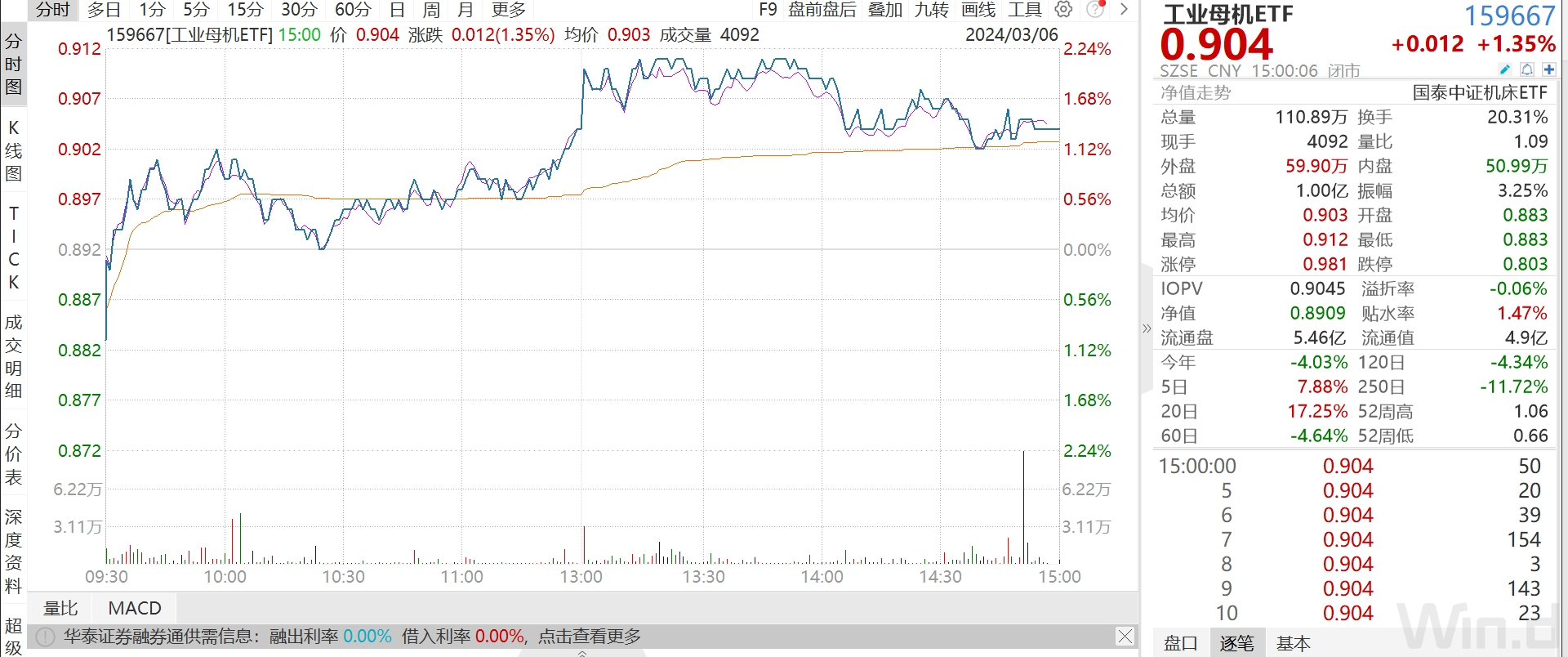 除了新能源板块外,工业机械指数3月6日表现同样突出。工业机械指数全天主力净流入超10亿元。工业母机ETF(159667)盘中涨超2%,收涨1.35%。