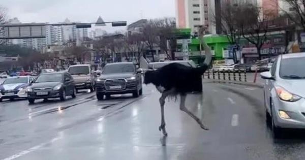 据报道,在韩国城南镇,一只鸵鸟在拥挤的交通中躲避了一个小时。