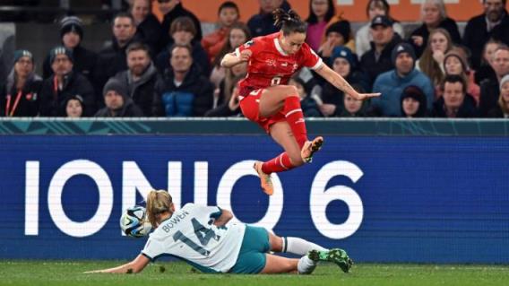 在国际足联女足世界杯比赛中,瑞士的杰拉尔丁·罗伊特勒被足球蕨类植物队的凯蒂·鲍恩擒抱。