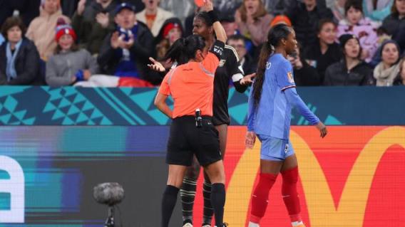 女足世界杯期间,裁判玛丽亚·卡瓦哈尔向牙买加的哈蒂贾·肖出示红牌。