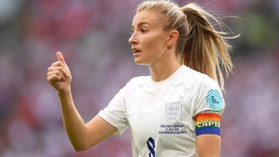 在温布利体育场举行的2022年欧洲杯女足决赛中,英格兰队队长利亚·威廉姆森戴着彩虹袖标。