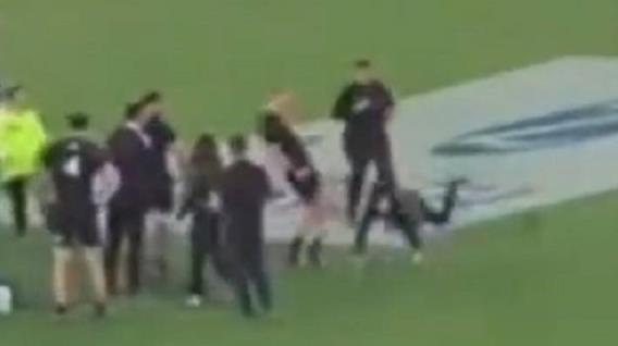 在门多萨,全黑队队长萨姆·凯恩伸出一只脚,绊倒了一名跑到球场上的年轻球迷。