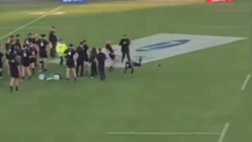 凯恩和他的全黑队队友在阿根廷球场以41比12战胜美洲狮队后聚集在一起,这名入侵者从他身边跑过。这名边锋伸出一只靴子,把他带到草皮上,然后很快站了起来。随后,一名保安继续追赶。