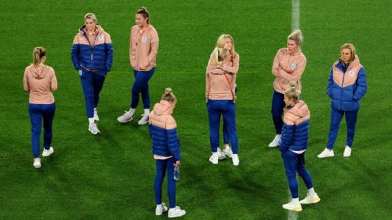 英格兰队的球员们在教练萨里娜·维格曼(右)的陪同下视察了澳大利亚体育场的球场。