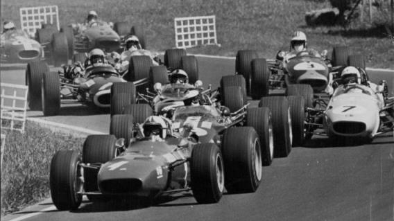 新西兰人克里斯·阿蒙在1968年新西兰大奖赛上一路领先。新西兰同胞丹尼·赫尔姆坐在第三辆车里。