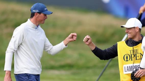 在皇家利物浦18号果岭,来自南非的业余选手克里斯托·兰普雷赫特与他的球童握手。